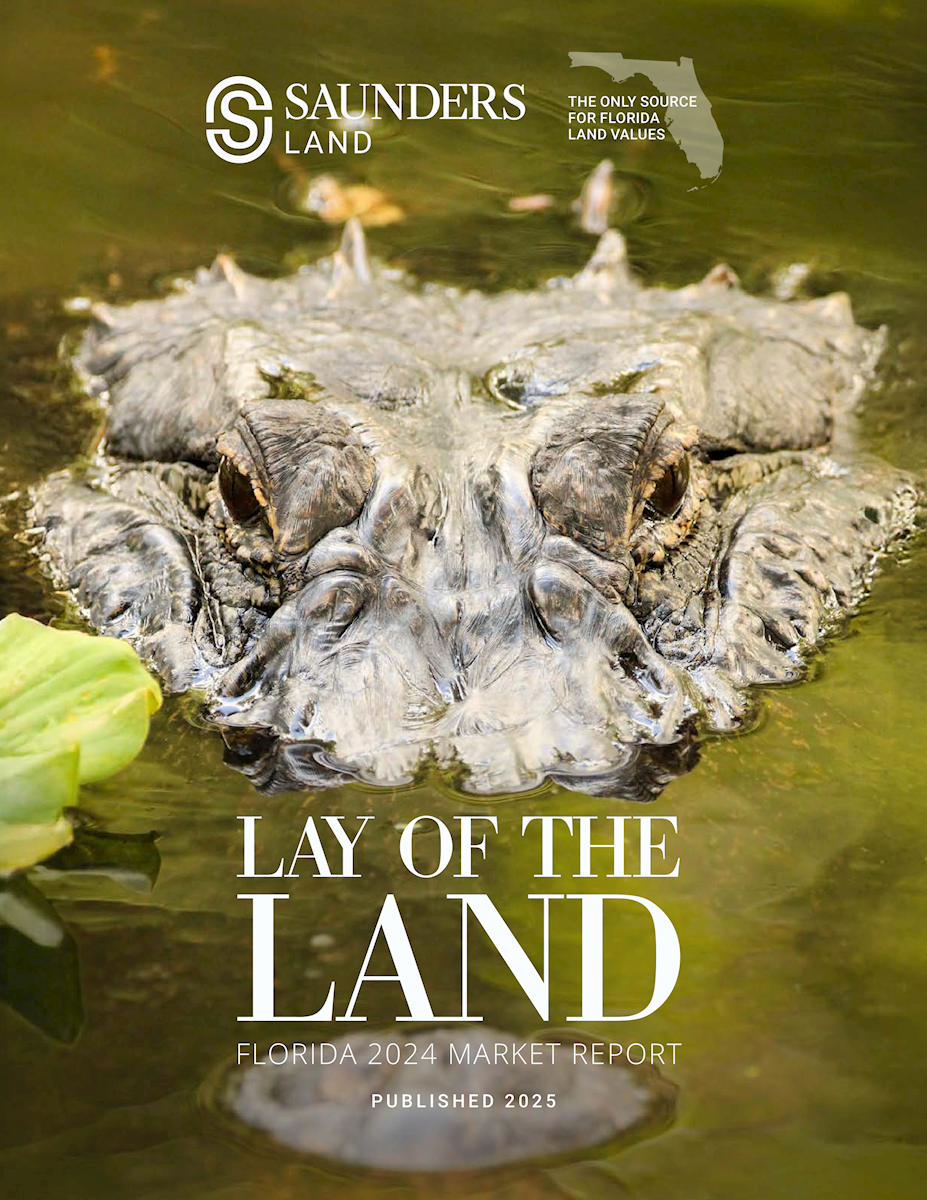 LAKELAND, FL, March 12, 2025 – Florida’s land market experienced a notable transformation in 2024, with large-acreage transactions driving sales despite an overall decline in volume. The latest Lay of the Land 2024 Florida Market Report, which was released on February 28, 2025 by Saunders Real Estate, reveals a dynamic landscape, highlighting the growing influence of institutional investors and high-net-worth buyers. Now in its 15th year, the report offers an in-depth look at land sales across the state, drawing from over 1,000 verified transactions and insights from key industry players.